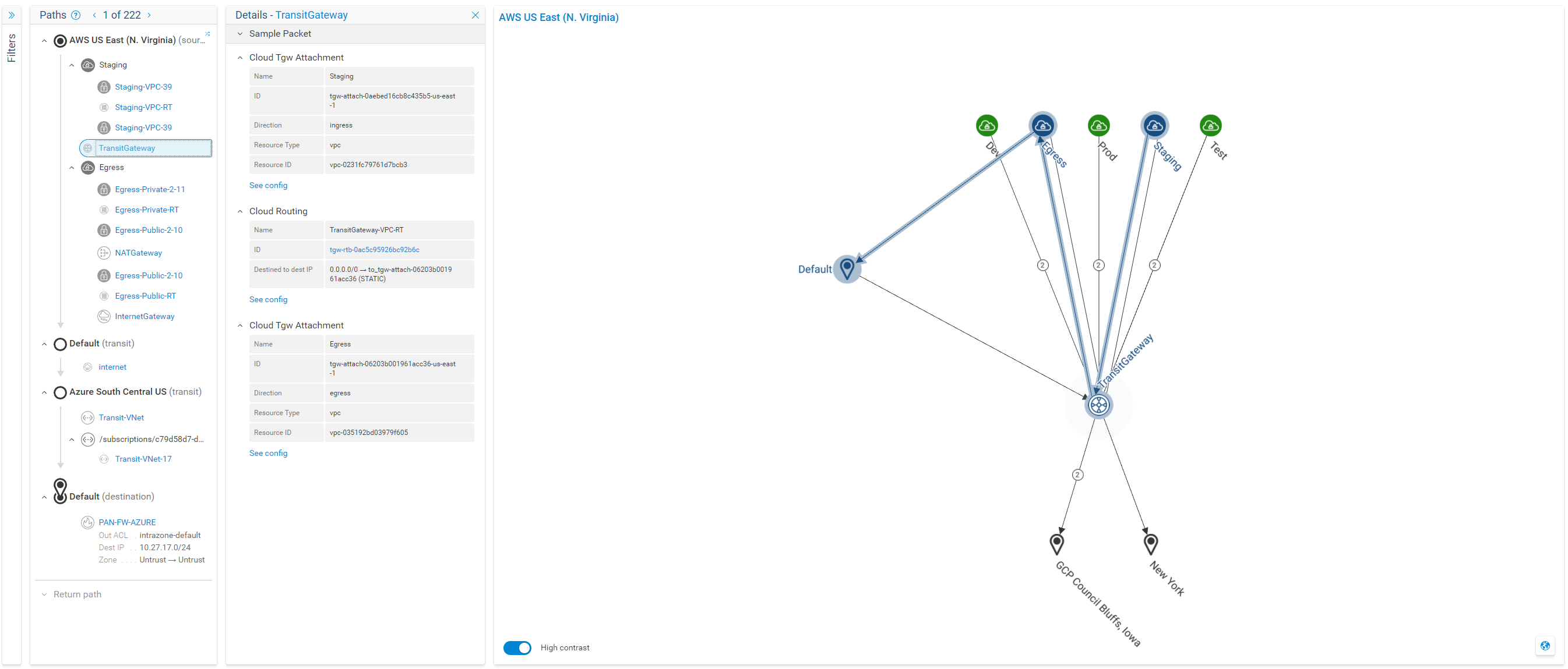 Anytime you want to explore more information about a specific element within your network, like a cloud platform, firewall or transit gateway, you can just click on that element in Forward Enterprise. For example, clicking on a platform in your environment from a major cloud provider, like Amazon Web Services (AWS), Google Cloud Platform (GCP) or Microsoft Azure, could show that you have four virtual private cloud instances (VPCs), one transit VPC, and several subnets related to that platform.