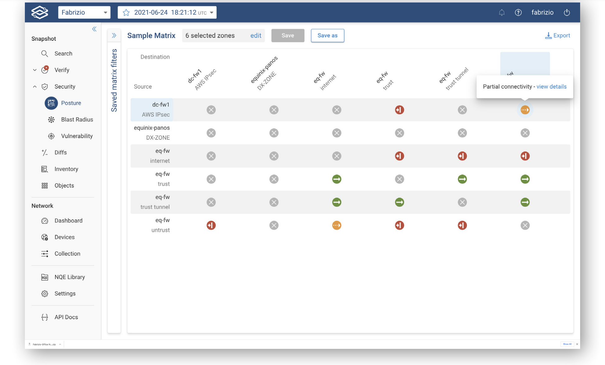 Network teams and security engineers need access to a single source of truth for the network’s behavior, so they can easily understand policy compliance at all times. The zone-to-zone connectivity matrix instantly indicates which zones in the network have open, partial, or no connectivity. They must also be able to validate network policies continuously and automatically every time there’s a change in the environment—a frequent occurrence—to prove security policy compliance and validate the organization’s zero trust architecture, if applicable. This helps to ensure an accurate picture of interzone connectivity is always maintained, and it also relieves teams of the need to update the policy matrix manually.
