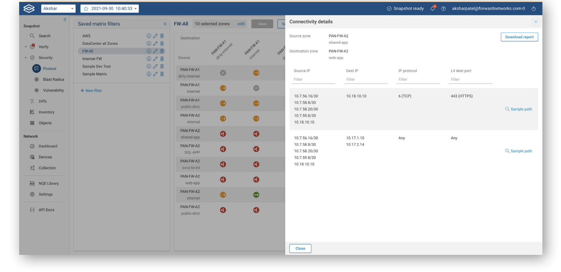 See for yourself how the zone-to-zone connectivity feature in the Forward Enterprise platform can help security operations professionals determine, at a glance, which zones in your network have full, partial, or no connectivity and whether network policies for security, including for zero trust, are working as expected. To see this feature and the power of a network digital twin, please request a demo.