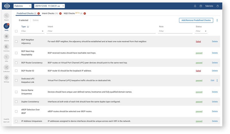 - Intent checks - Users can create their own intent based verification checks through defined path search for existing path, or isolated path or reachability to a specific host/destination.