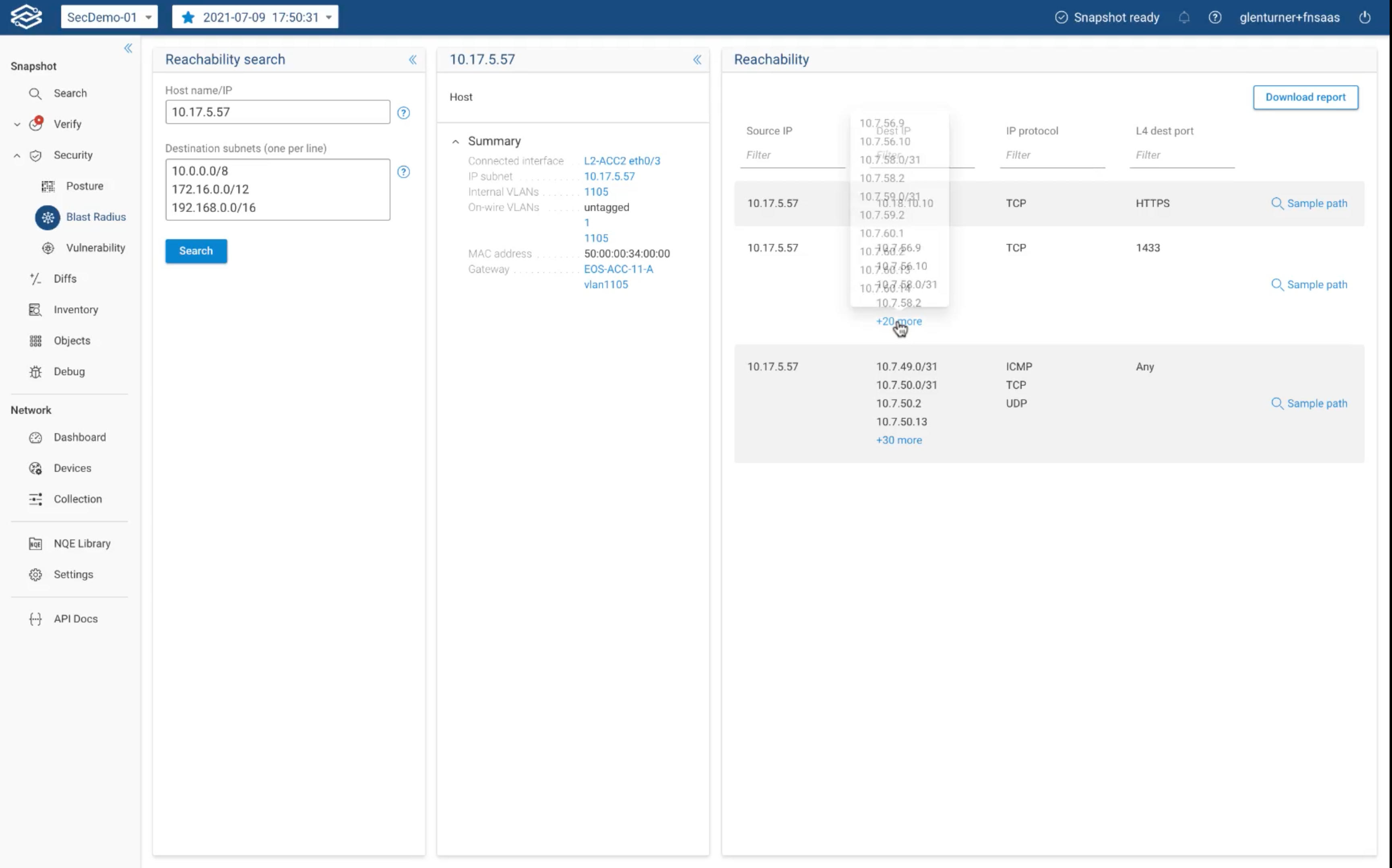 View a comprehensive table and all possible flows from the host to the destination subnets, including protocol and L4 destination port. In a single click, you can download a report that documents the blast radius.