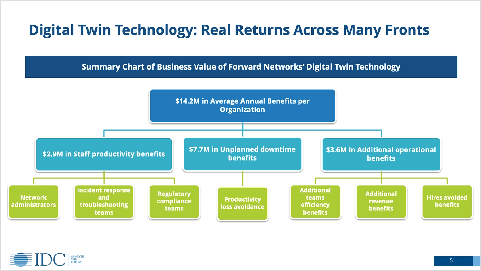 According to IDC’s Business Value of Forward Networks study, organizations using Forward Enterprise, the industry’s leading network digital twin platform, realize an average of $14.2 million in annual benefits per organization. This figure includes: