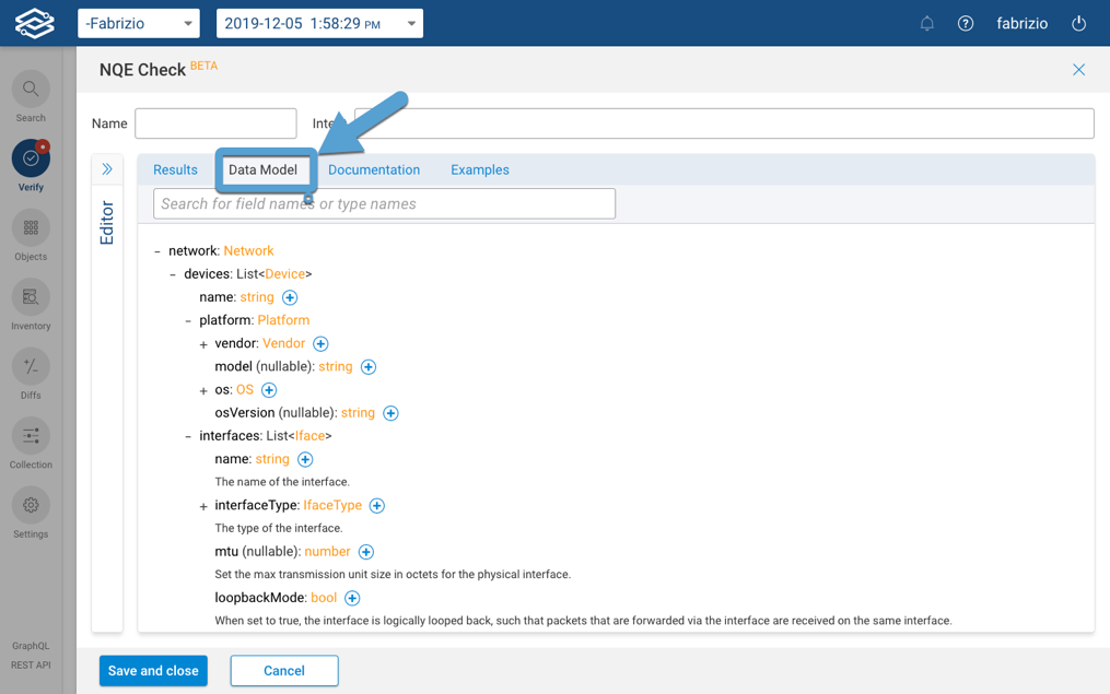 The NQE Data Model can be explored using the built-in data model explorer that helps users find the relevant fields needed for the check, as shown in the picture below: