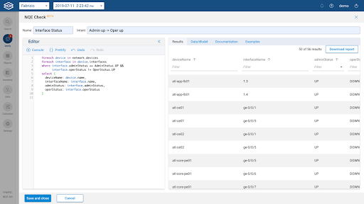 The picture below shows a check that queries for interfaces with administrative status UP but with operational status other than UP– a fairly common scenario operators often need to monitor to validate the links’ health.
