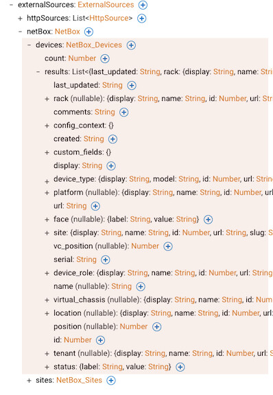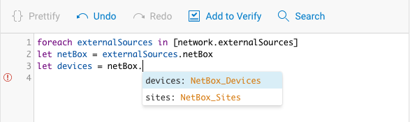 Now that we have the data, we compose queries using our rich IDE capabilities. Below you can see our code completion displays all the available collections under the NetBox external source.