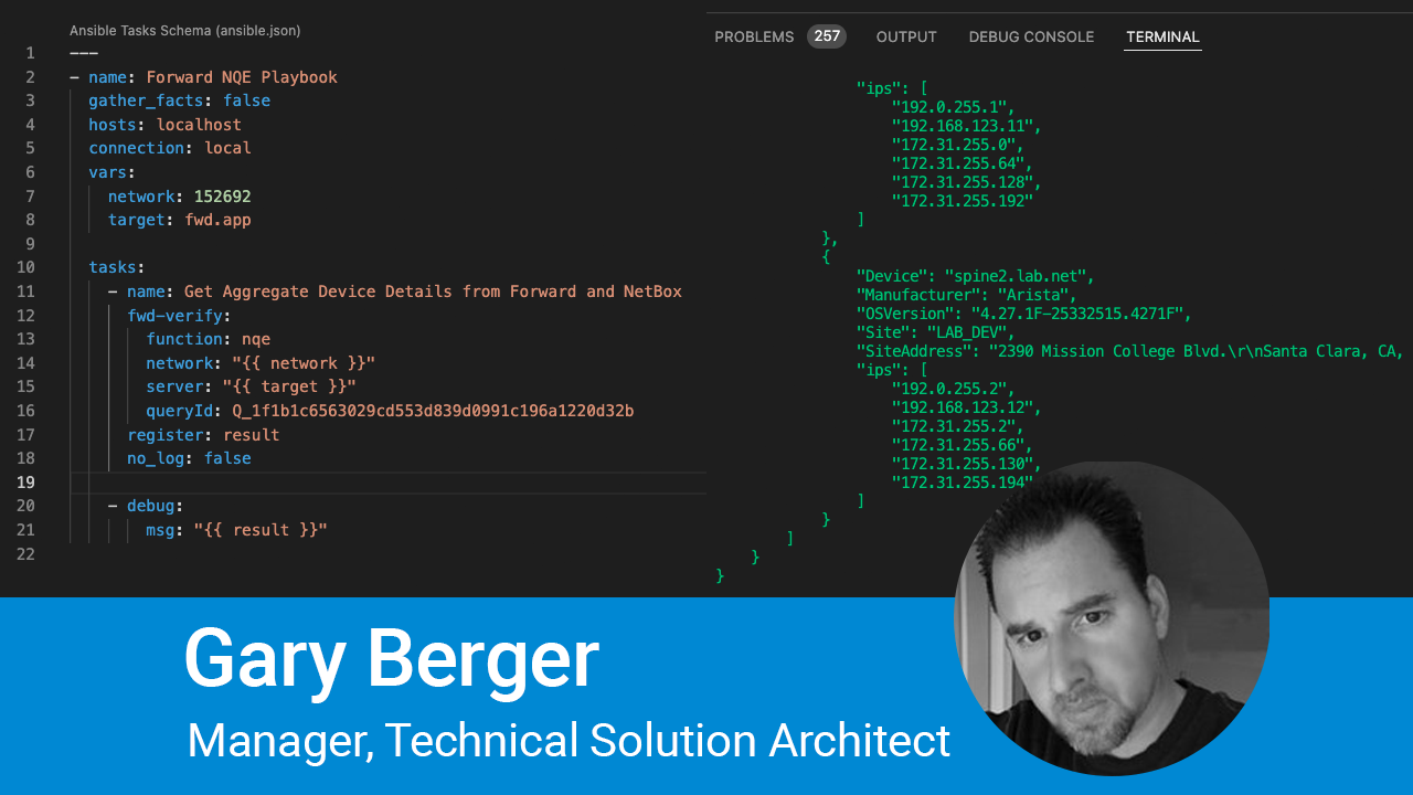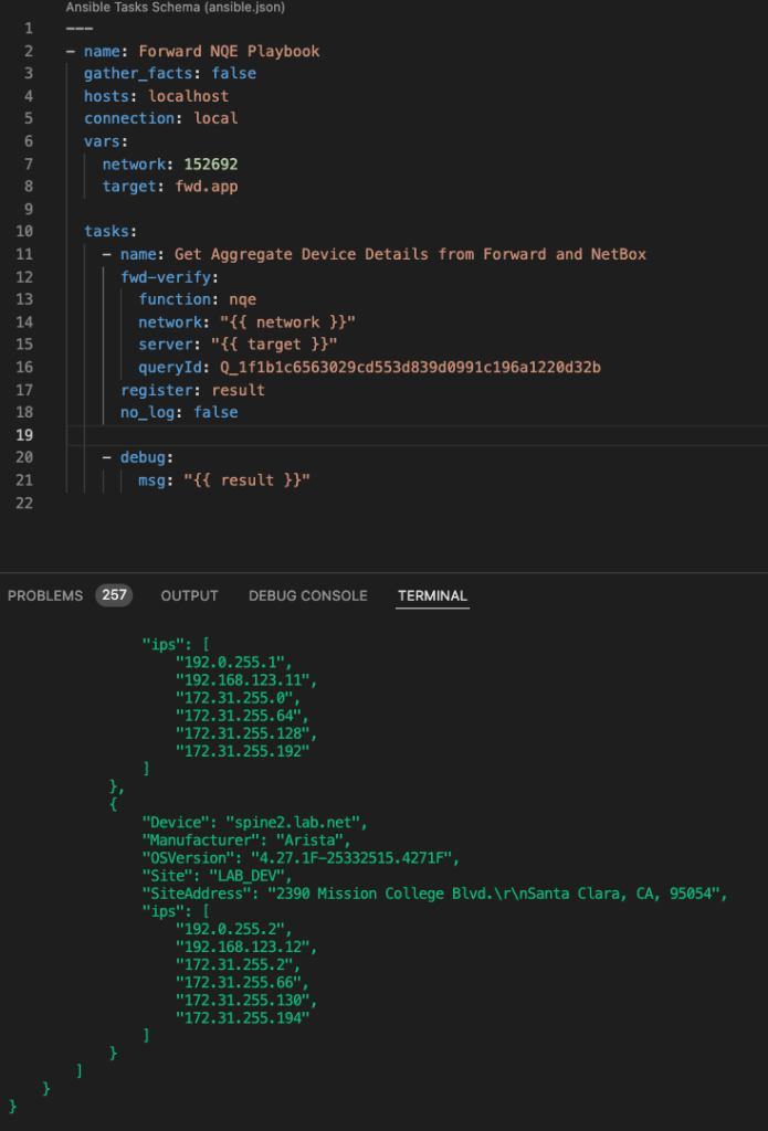 In the below example, we create an Ansible module to call the NQE API interface as a task so it can be combined with additional workflows.