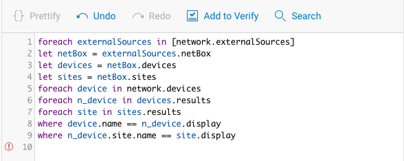The two where clauses in lines 8 and 9 below join the existing Forward Enterprise device collection with the NetBox devices inventory as well as joining the NetBox devices collection with sites collection allowing us to create a composite output of three independent data sources.