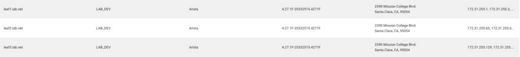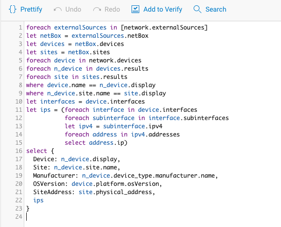 The final query below combines data from these three sources allowing us to take the device name, site name and manufacturer from the NetBox devices collection, Site address from the sites collection, and interface IP addresses from Forward Enterprise Data model to produce an aggregate report.