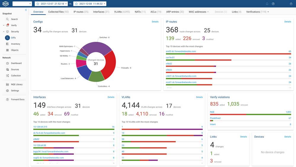 • Behavior Diffs: side-by-side comparison in one quick view of configuration file and state changes for any device, between any points in time. Identify what policy rules and behavior checks have changed between snapshots. Quickly see new device connections, topology changes, and interface updates. Learn how routes are altered due to changes with the ability to filter results by VRF, next-hop address, IP destination, and more.