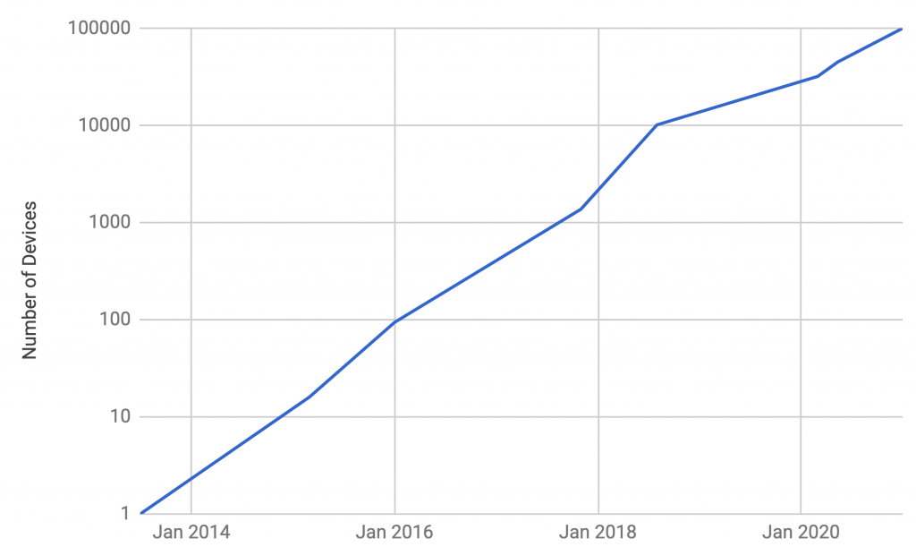 Then almost every year we were able to process a 10x larger network. Today, we have tested our software on a very complex network with 45k devices. We are currently working on further optimization and scaling efforts and our projection is to get to 100k devices in Dec 2020. The following graph shows our progress our last couple of months and the projection till Dec 2020 on logarithmic scale: